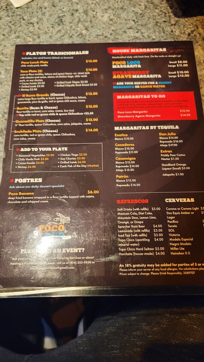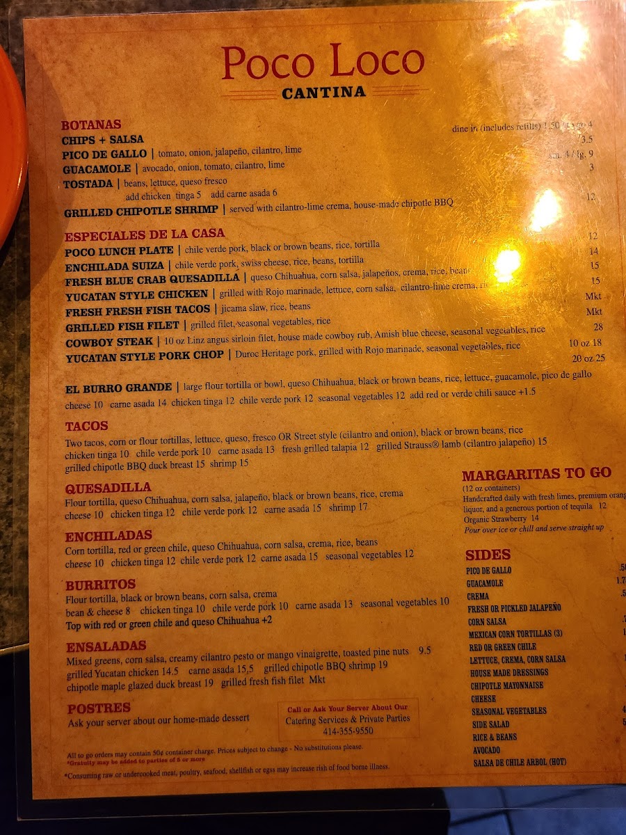 Poco Loco, located at 4134 W River Ln, Brown Deer, WI, offers a delightful range of dishes that reflect the vibrant flavors of Mexican cuisine. The menu is designed to cater to a variety of tastes, ensuring a satisfying experience for every diner.